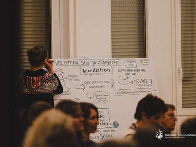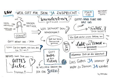 Damaris Hoppe, Theologin und Autorin, zeigte anhand von Psalm 139 eindrücklich, welches Bild Gott von uns hat. Gott hat uns kunstvoll geschaffen. Wie bei der Stoffweberei hat er goldene Fäden in unseren Charakter und unser Wesen eingewoben – kreativ, einzigartig und von unschätzbarem Wert. Er hat unser Inneres geformt, auch unsere sensiblen Seiten. Er hat uns erdacht und kennt uns durch und durch. Unser eigenes Bild von uns selbst sieht oft ganz anders aus: Schwächen, Fehler, Scham und Schuld prägen unsere Gedanken. Doch Gottes JA über uns steht fest. Diese Zusage war die Kernbotschaft des gesamten Frauentags und sie gilt ebenso für unser Leben. Tabea von HopeLettix hat den Vortrag von Damaris in ausdrucksstarken Sketchnotes festgehalten.